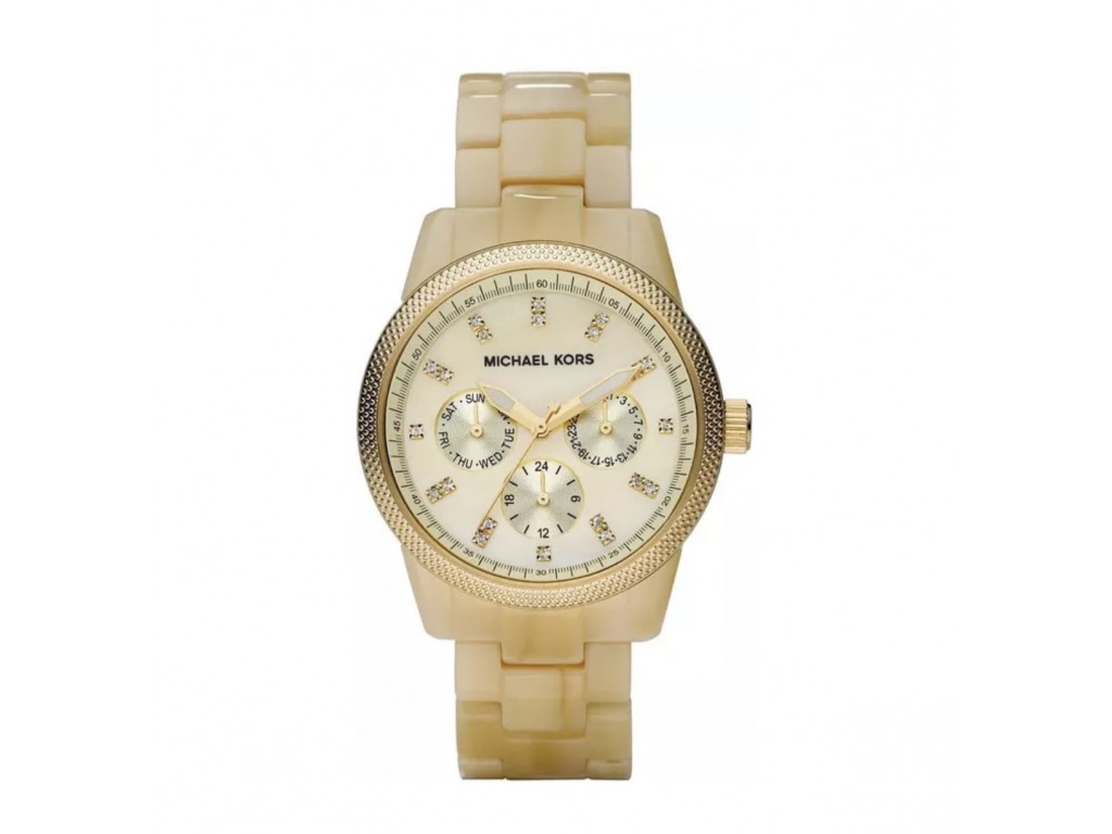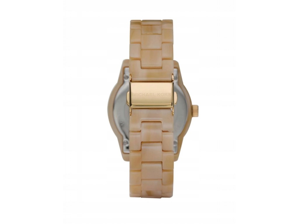 Oryginalna bransoleta do zegarka Michael Kors do modelu MK5039 wykonana z akrylu - tworzywa sztucznego - w kolorze beżowym, zapięcie wykonane ze stali nierdzewnej w kolorze złotym z napisem Michael Kors.