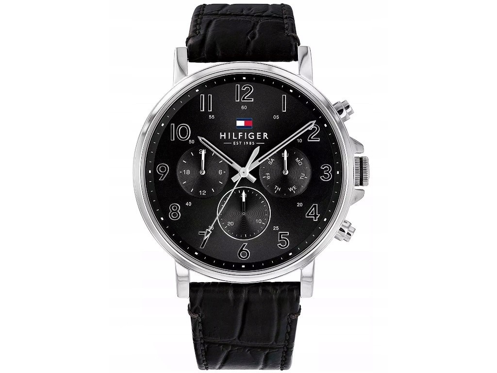 Oryginalny pasek do zegarka marki Tommy Hilfiger TH1710381, wykonany ze skóry naturalnej w kolorze czarnym z tłoczeniem aligatora, sprzączka wykonana ze stali nierdzewnej w kolorze srebrnym połysk z logo marki, przeszyty nicią w kolorze paska.
