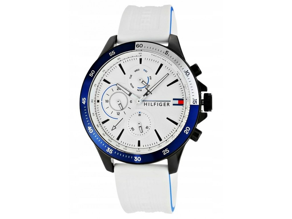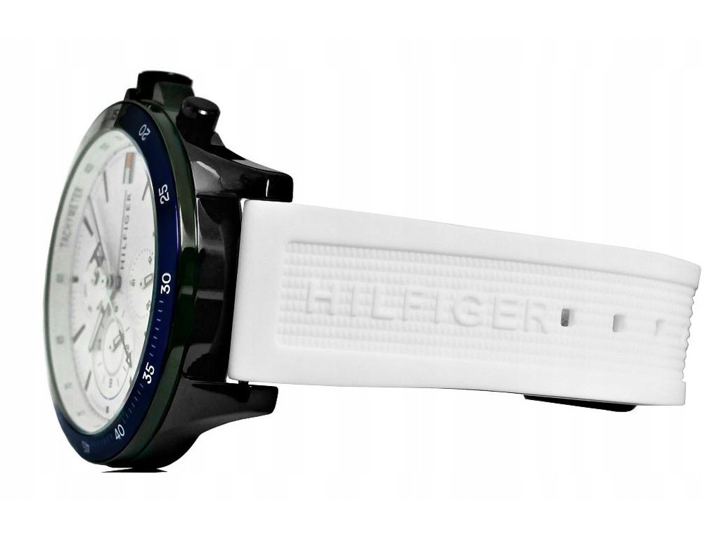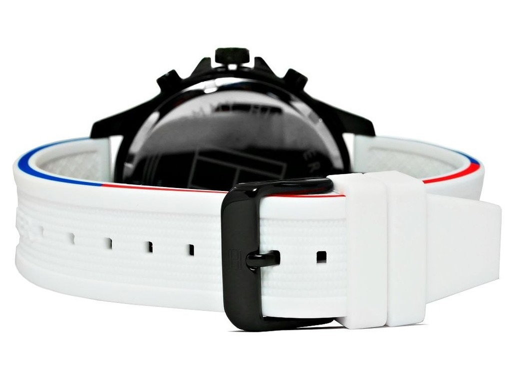 Oryginalny pasek do zegarka marki Tommy Hilfiger TH1791723 gumowy w kolorze białym, sprzączka wykonana ze stali nierdzewnej w kolorze czarnym połysk z logo marki, boki paska w kolorze marki biały czerwony i granatowy.