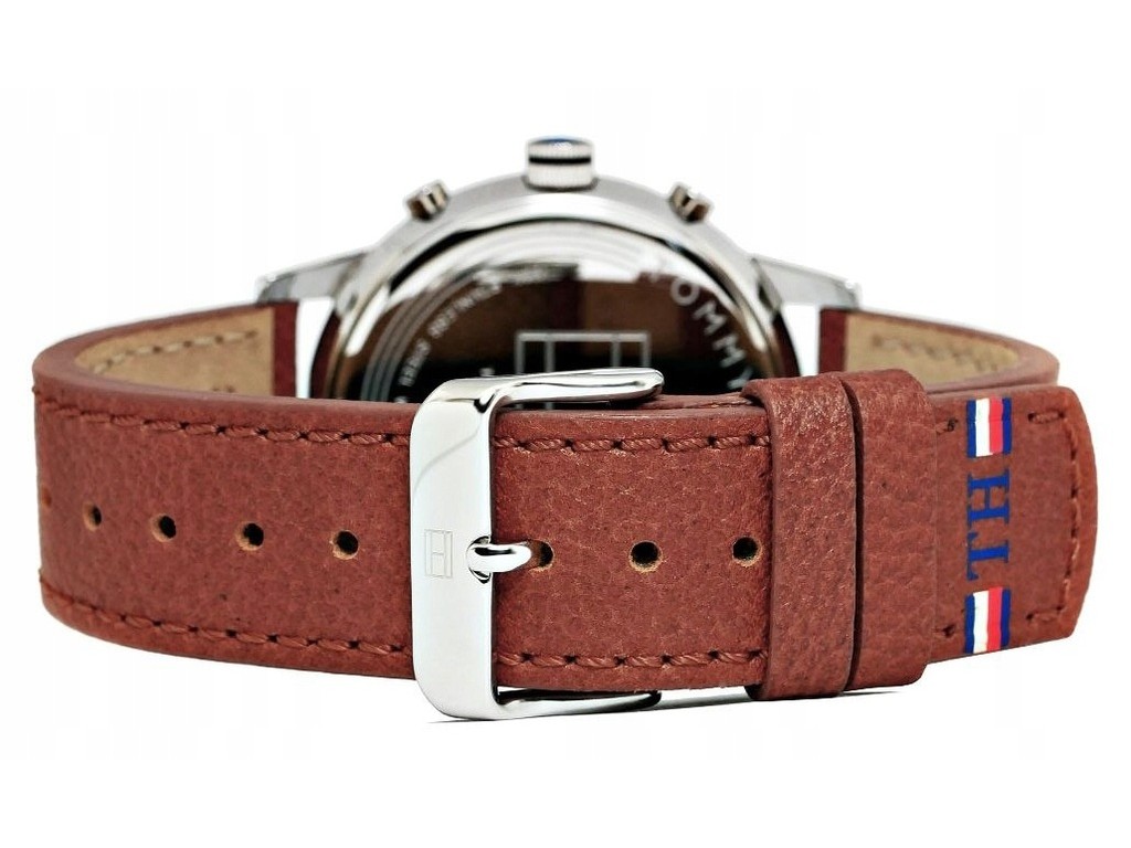 Oryginalny pasek do zegarka marki Tommy Hilfiger TH1791629, wykonany ze skóry naturalnej w kolorze brązowym, sprzączka wykonana ze stali nierdzewnej w kolorze srebrnym połysk z logo marki, przeszyty nicią w kolorze paska, na pasku faktura skóry.