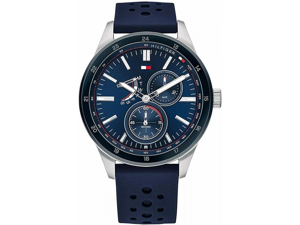 Oryginalny pasek do zegarka marki Tommy Hilfiger TH1791635 silikonowy w kolorze granatowym, sprzączka wykonana ze stali nierdzewnej w kolorze srebrnym połysk z logo marki, na pasku ozdobne czerwone i białe elementy.