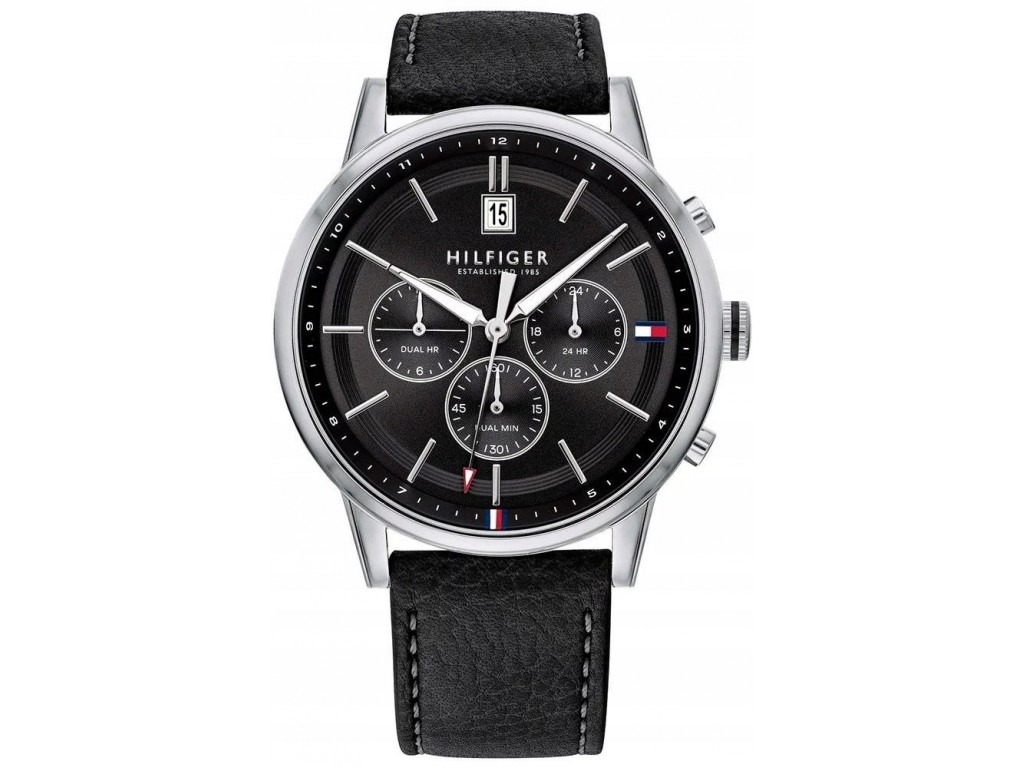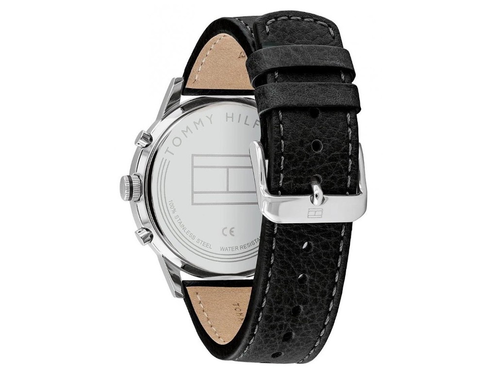Oryginalny pasek do zegarka marki Tommy Hilfiger TH1791630, wykonany ze skóry naturalnej w kolorze czarnym, sprzączka wykonana ze stali nierdzewnej w kolorze czarnym połysk z logo marki, przeszyty jasną nicią, gładki, na pasku z logo marki.