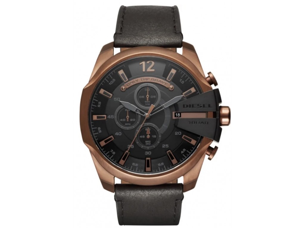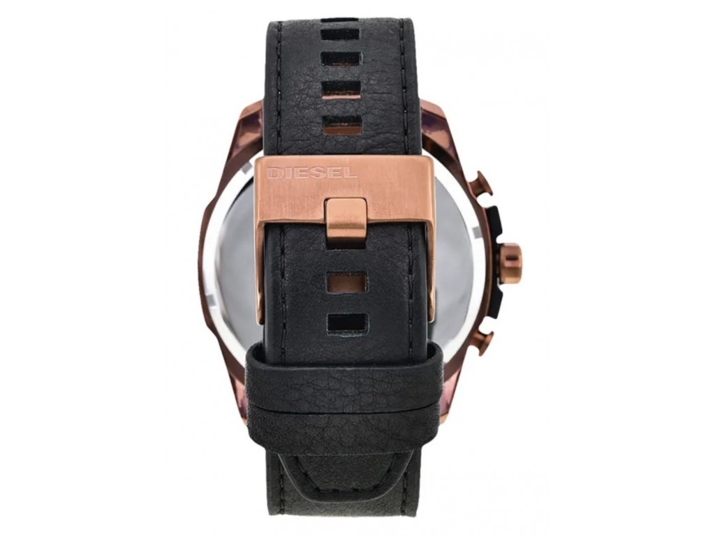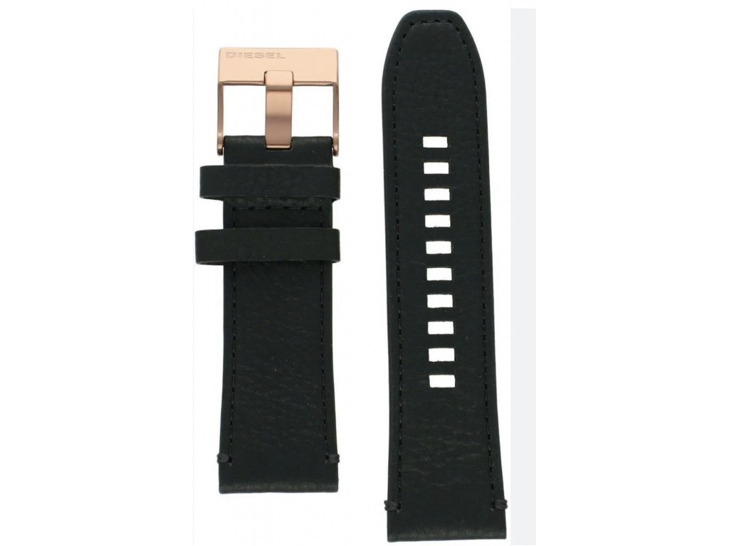 Oryginalny pasek do zegarka marki Diesel do modelu DZ4459, wykonany ze skóry naturalnej w kolorze czarnym, przeszyty, sprzączka wykonana ze stali nierdzewnej w kolorze miedzi matowa z napisem Diesel.