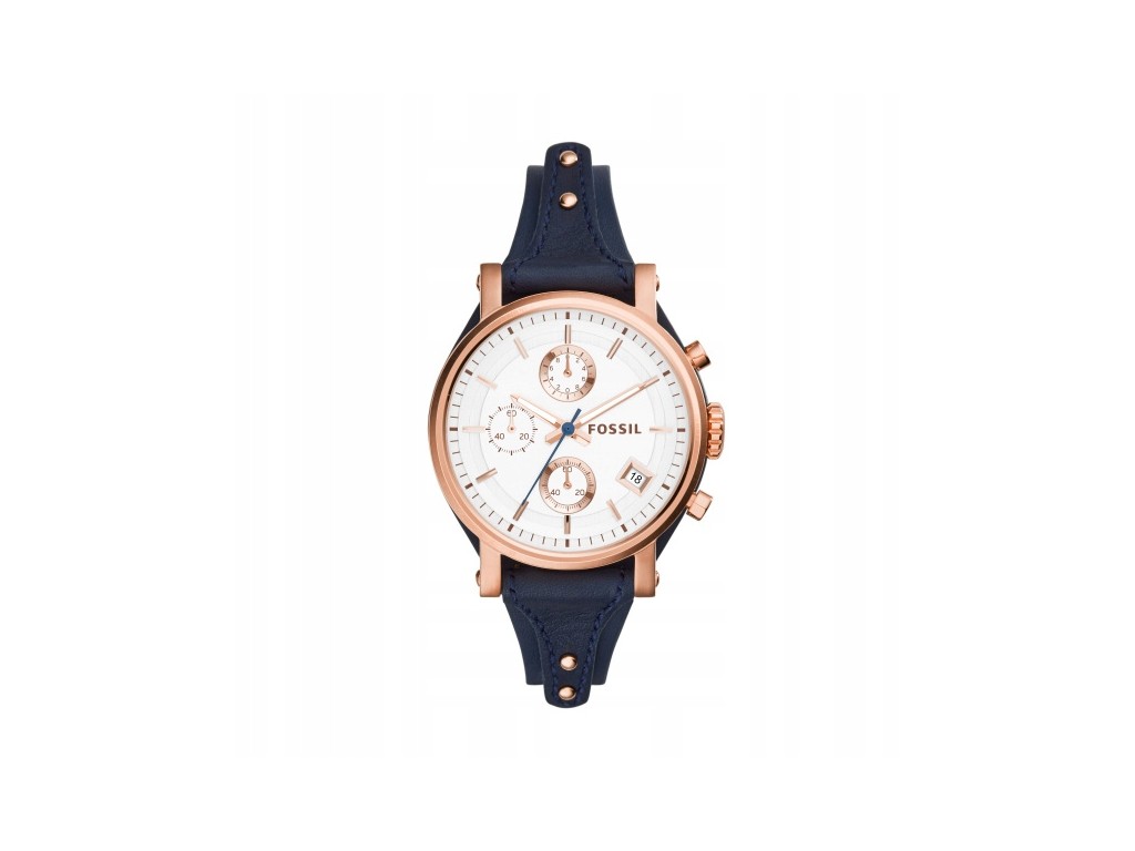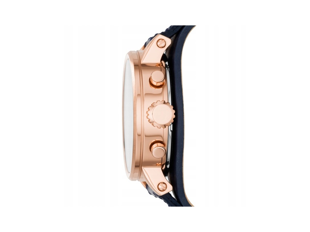 Oryginalny pasek do zegarka marki Fossil Boyfriend do modelu ES3838 wykonany ze skóry naturalnej w kolorze granatowym, gładki, matowy, z podkładką, sprzączka wykonana ze stali nierdzewnej w kolorze różowego złota. Na pasku ozdobne ćwieki w kolorze różowego złota.